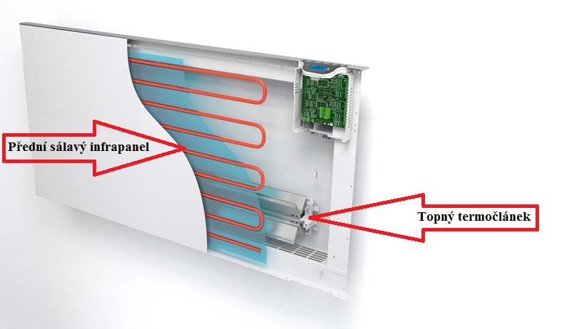 V přední části radiátoru se nachází sálavý infrapanel, zatímco vzadu v jeho spodní části je v keramickém pouzdru uložen topný karbonový termočlánek. Tento duální topný systém v režimu AUTO nastavuje umělá inteligence podle pohybu osob v místnosti, čímž zajišťuje úspornou spotřebu elektrické energie. Pokud se v místnosti nikdo nepohybuje, umělá inteligence sama sníží topnou teplotu. Jakmile však zachytí pohyb, rychle vytvoří skvělou tepelnou pohodu.