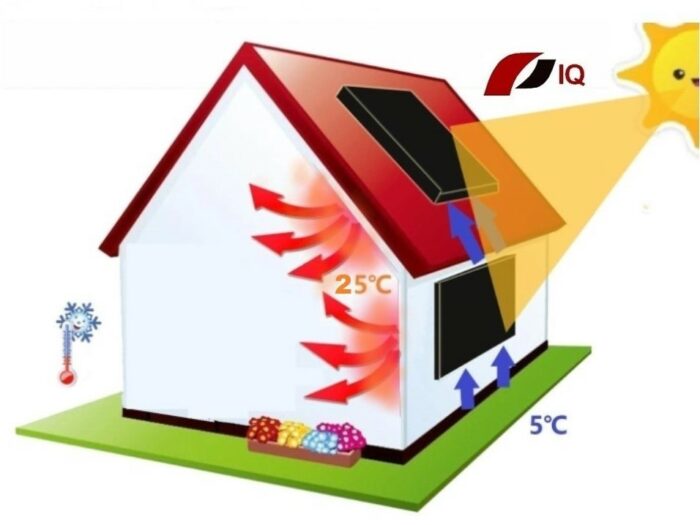 Topná teplota, respektive teplota ohřátého vzduchu cirkulujícího uvnitř IQ-OS panelu je závislá na intenzitě slunečního záření.
