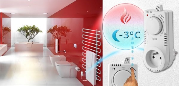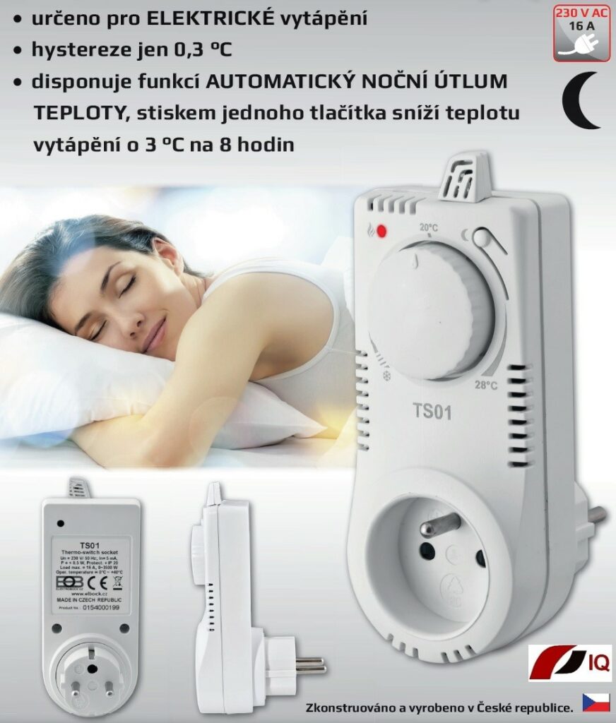 Termostat TS01 má jednoduché manuální ovládání s možností nastavení nočního útlumu teploty o 3°C pouhým stiskem tlačítka a to na dobu 8 hod. Pak se teplota automaticky vrátí na nastavenou hodnotu.